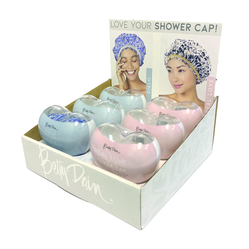 The Real Love & Cielo Display houses six durable and mold-resistant PEVA shower caps in heart-shaped containers.