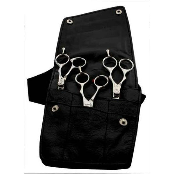 Soft leatherette shear case with flap closure, 6 pockets tool belt holder. Holds shears, clips and combs. Size 5 1/2 x 13 1/2. Keep your tools safe and clean. Also keep your tools close at use or when transporting between hand while in use. Tools not included.