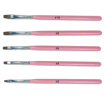 Brushes feature flat, synthetic bristles for a smooth, even application of gel. Includes gel brush sizes 2, 4, 6, 8 and 10 and a brush holder. Brushes measure 5-3/4"L.