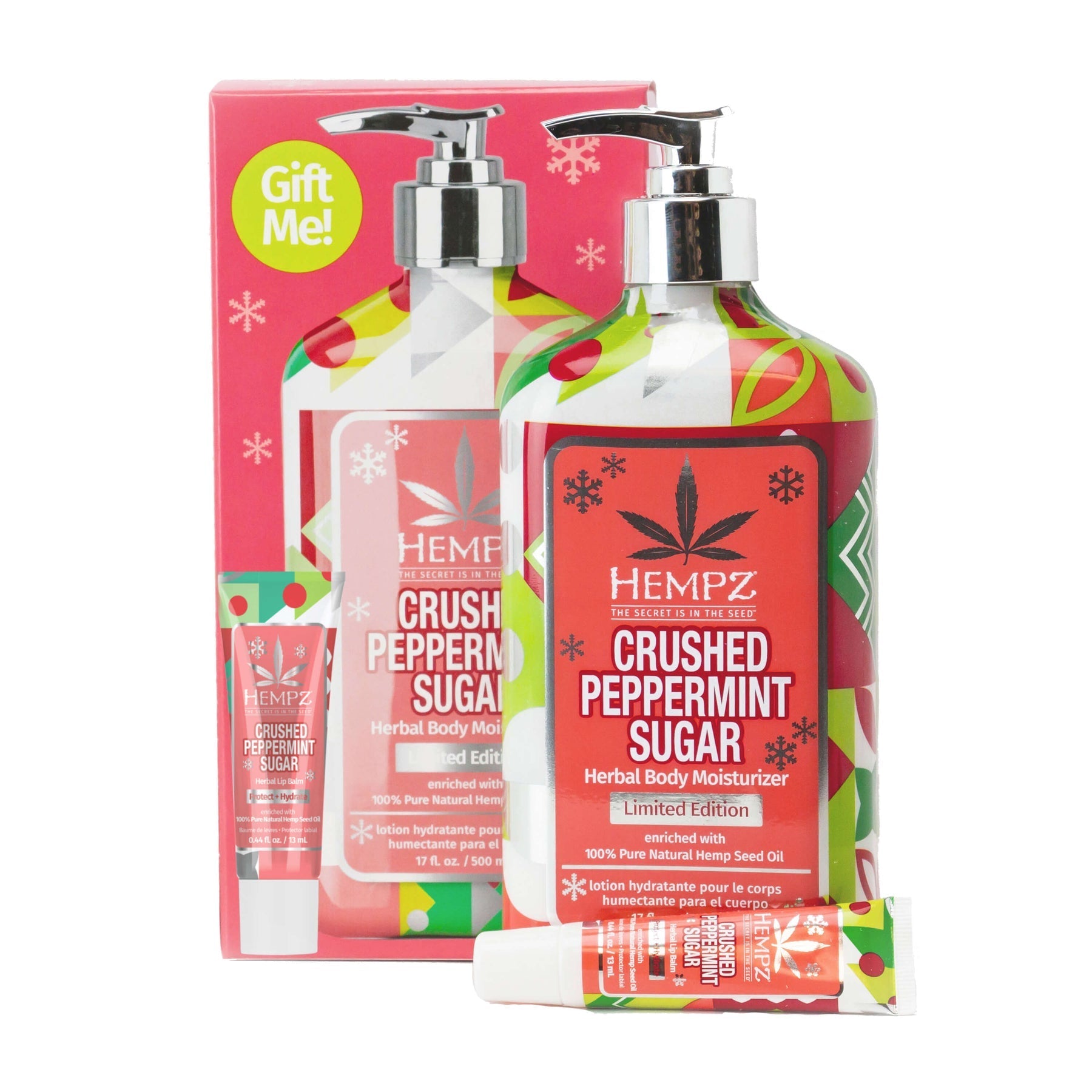 Our new holiday scent—Crushed Peppermint Sugar—in a moisturizing lotion and refreshing lip balm, packaged in a ready-to-give gift set. Lotion, 17-ounce pump bottle. Lip balm, 0.44-ounce tube.