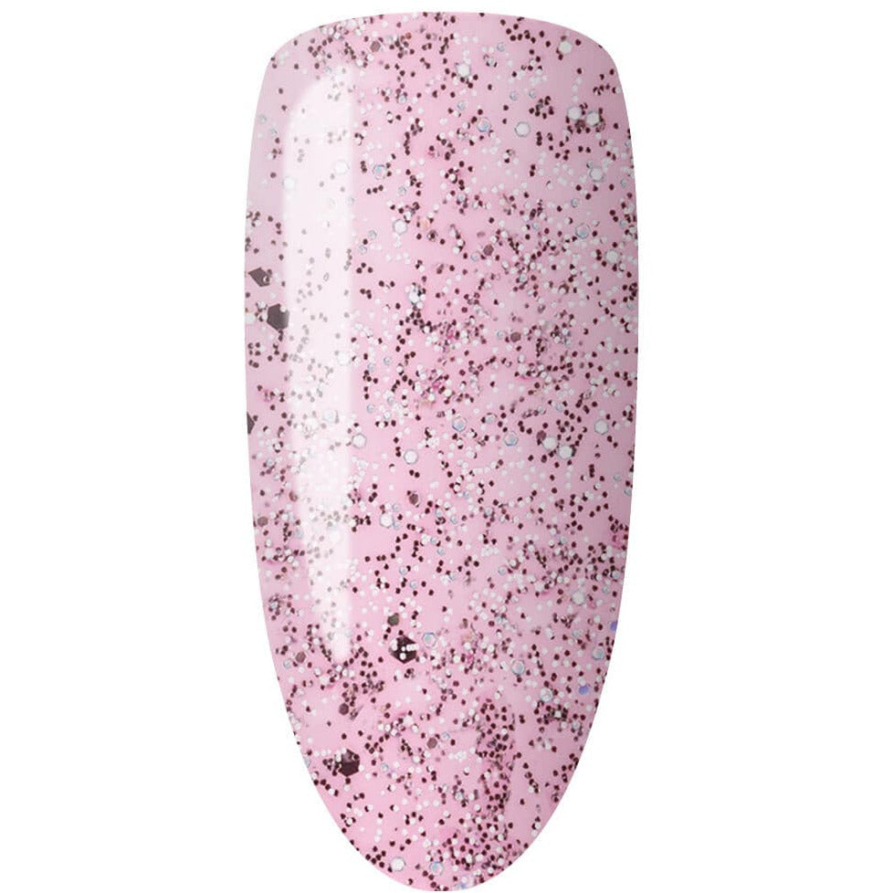 Silver hexes and glitter on a sheer pink base.
