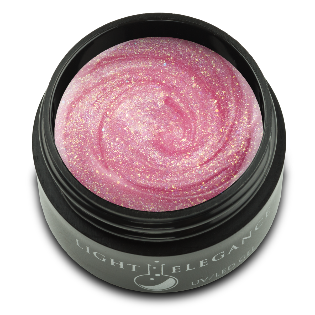 A shimmery champagne pink with small pieces of iridescent glitter. This soft pink sports a touch of refreshing light gold sparkle oozes class.