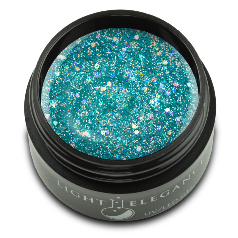 Fine pieces of soft aqua blue lightly laced with large iridescent pretties. This green and blue glitter come together to make a tranquil and serene aqua