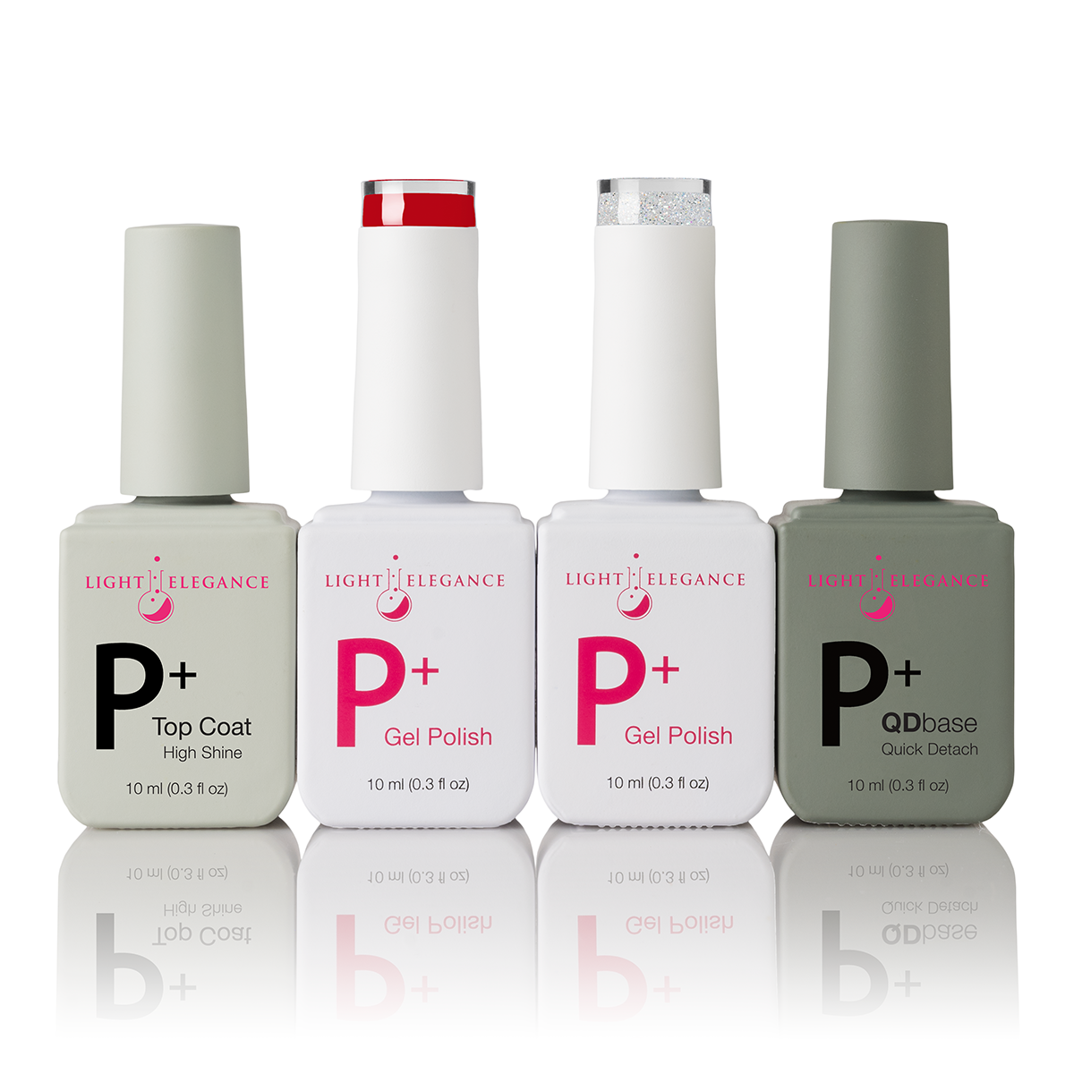 P+ Hello Kit includes 10 ml P+ QDbase, P+ Red Rover Gel Polish, P+ Tiny Diamond Glitter Gel, and P+ High Shine Top Coat.