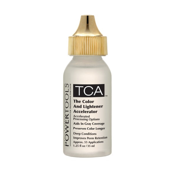 TCA, the original color accelerator, processes permanent color, semi-permanent color, demi color, bleach, foil & high lift applications in half the time when added to any manufacturer’s color or lightening product.