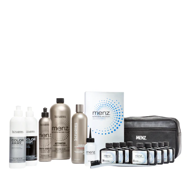 A unique haircolor system specifically designed for men with time and privacy in mind. MENZ 5 Minute Haircolor processes in 5-10 minutes at the shampoo bowl, making the service quick, convenient and discreet. -- A unique haircolor system specifically designed for men with time and privacy in mind. MENZ 5 Minute Haircolor processes in 5-10 minutes at the shampoo bowl, making the service quick, convenient and discreet. Blends or completely covers gray hair Can be used alone or as a custom blend, perfect for any client Colors in a matter of minutes as a full head or partial application Safe for use on beard and mustache